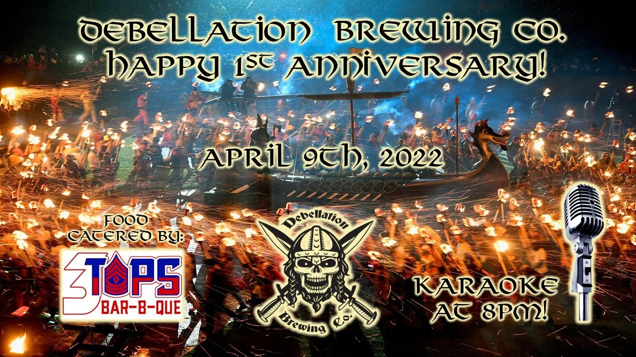 Come celebrate a year of Debellation Brewing! It's been one hell of a year! Come celebrate with us as we will have 3Tops BBQ catering it ALL DAY with karaoke following at 8pm! Enjoy 15% off all tabs too! We will also have 2 new beer releases to enjoy!