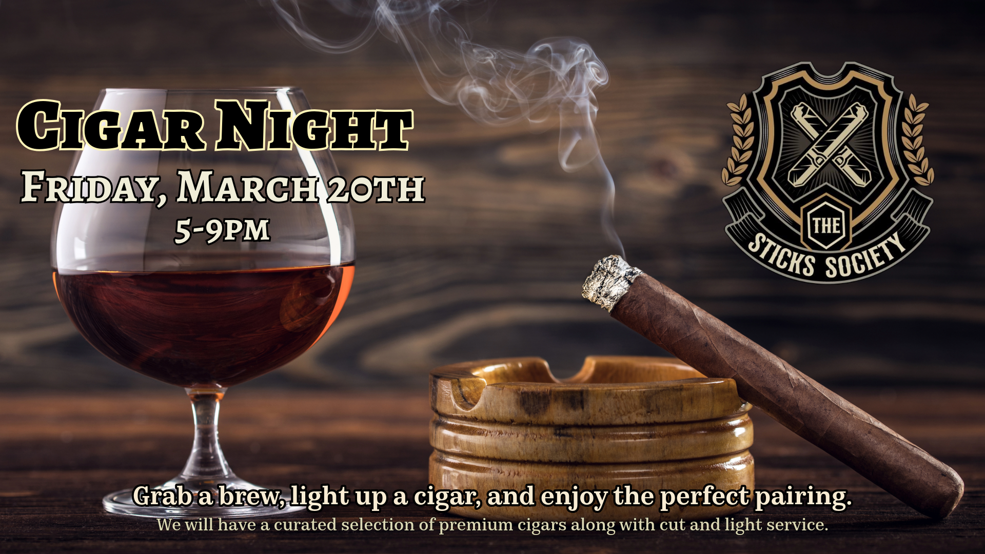 The Sticks Society is a mobile cigar service based out of Savannah who offers premium cigars along with light service and education. They will have a pop-up here for this event! You are of course welcome to bring your own cigars, but The Sticks Society is here if you need them. We will have some great bourbon, scotch, and beer options for pairing. We are looking forward to this event!