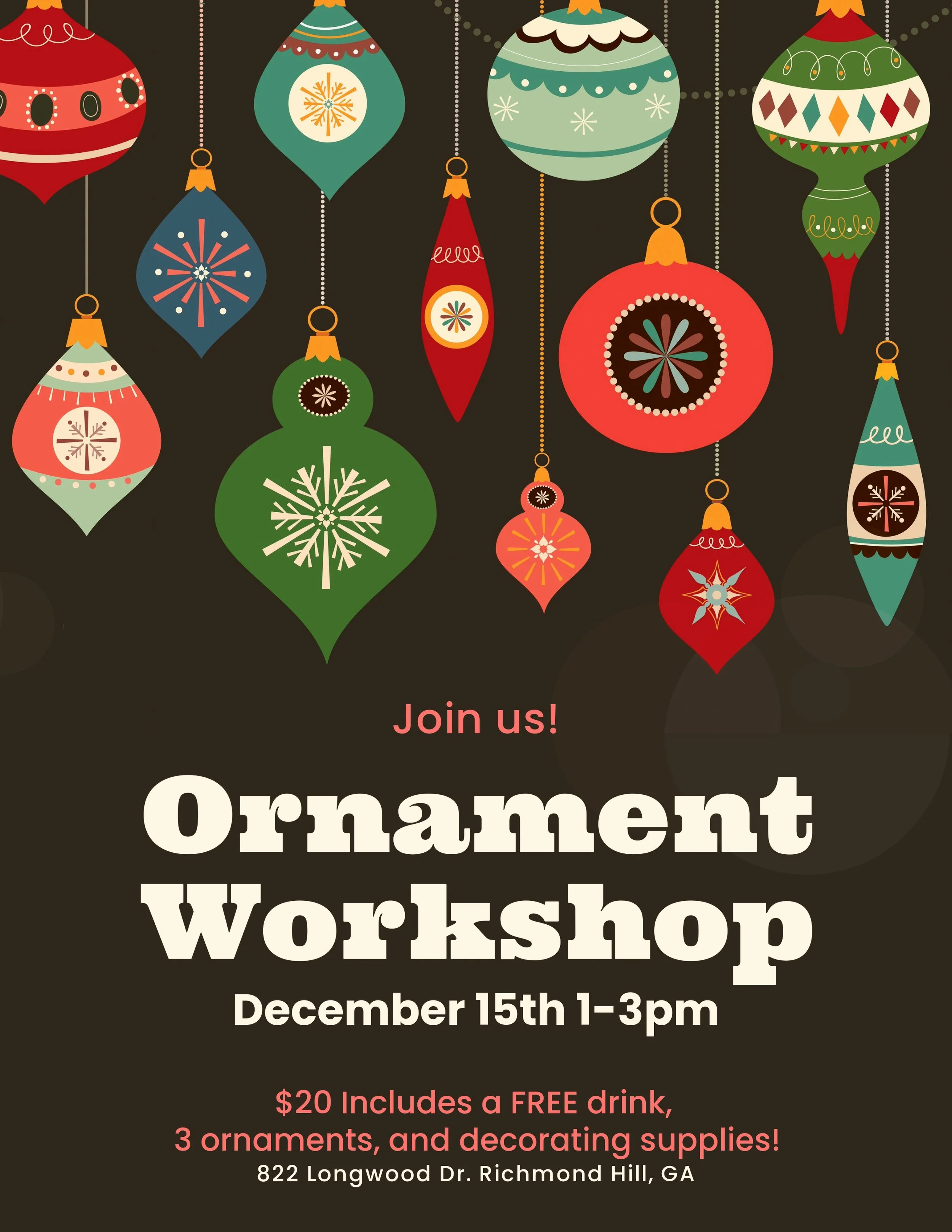 Come join us in decorating those last ornaments to add to your tree! $20 will get you one FREE drink, 3 blank ornaments, and supplies!