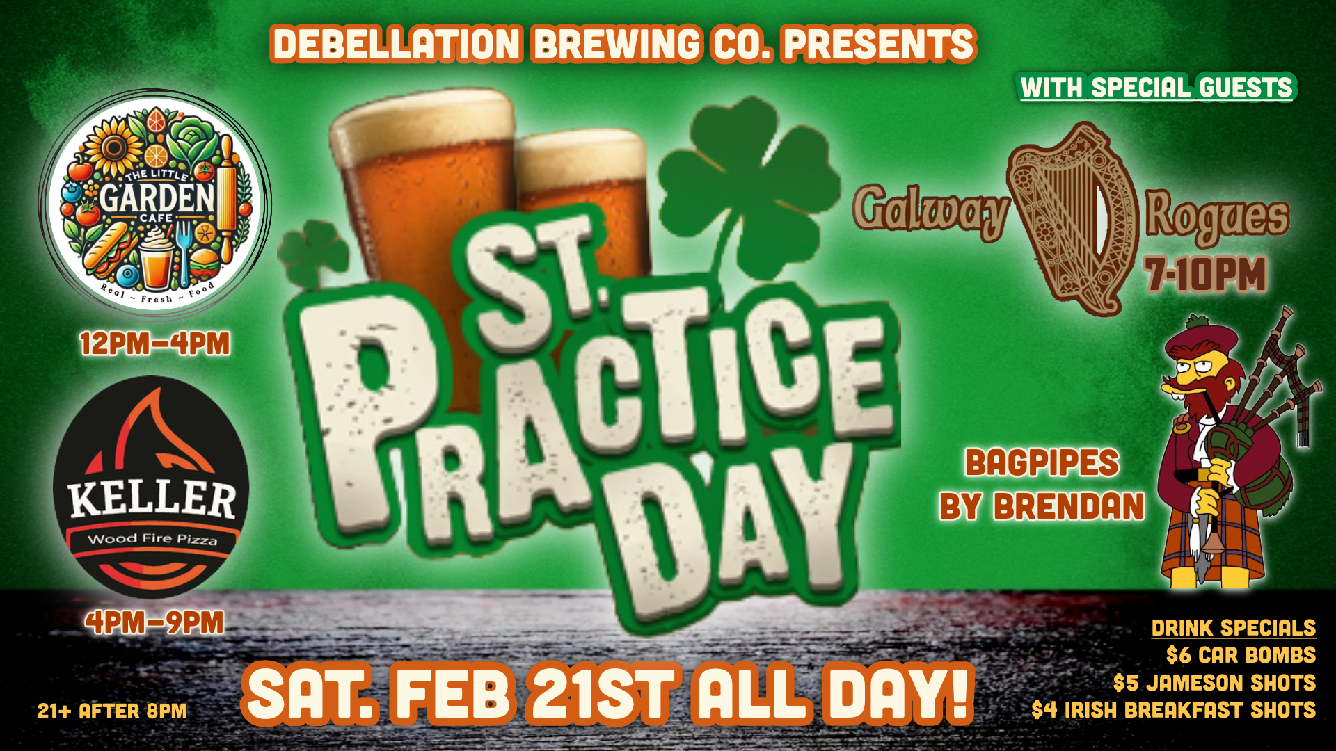 Yes, we know St. Patrick’s Day is next month, that why we are getting our St. PRACTICE on! It's the perfect day to get your livers in practice for the real deal only weeks after! This ALL DAY event is filled with all the shenanigans that St. Paddy’s entails: live music, food trucks, drink specials, all the things!